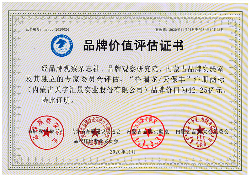 我天宇汇景集团旗下“格瑞龙/天保丰”品牌荣获“第七届内蒙古品牌大会百强品牌”,同时,集团总裁陈璞先生荣获“2020内蒙古品牌人物——内蒙古品牌建设企业家领袖”,经品牌观察杂志社、品牌观察研究院、内蒙古品牌实验室及其独立的专家委员会评估,天宇汇景“格瑞龙/天保丰”注册商标,品牌价值为42.25亿元。